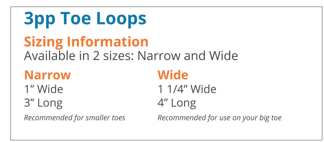 The 3pp Toe Loops are designed to fit almost any toe. The Narrow will generally fit the four (4) small toes. The Wide strap is designed to wrap the Big toe and the first small toe together and is also recommended following surgery when bandages or swelling enlarge the smaller toes.
